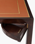 While Antonio’s DNA is all 1930’s Italian, this sleek modern game table translates perfectly in today’s homes. The gilt-tooled leather top is ready for play, with pivoting hinged drawers on the frieze. All supported on bold square legs and set on tapered brass cappings. Shown in Cambridge Finish with Inset Leather finish standard.