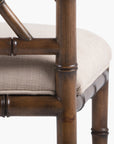 The Circles Side Chair features an interlocking circle design crafted from rattan framing with leather accents in honey and ebonized black two-tone finish. Upholstered with a linen flax color upholstery. Also available as bar and counter stool.