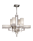 Chandelier in a warm muted silver leaf finish and hand tailored laminated shades of multi-tonal white crepe and coordinating trim. Includes a 6′ adjustable rod. Also available in patinated golden bronze finish: 733840. Canopy adapts to vaulted ceiling.